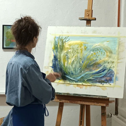 Die im Tanz auftauchenden inneren Bilder, Stimmungen und Körpererleben zeigen sich im Bild in ihren unterschiedlichen Qualitäten als Flächen, in Linien, Landschaften oder in Form von abstrakten Farbräumen.